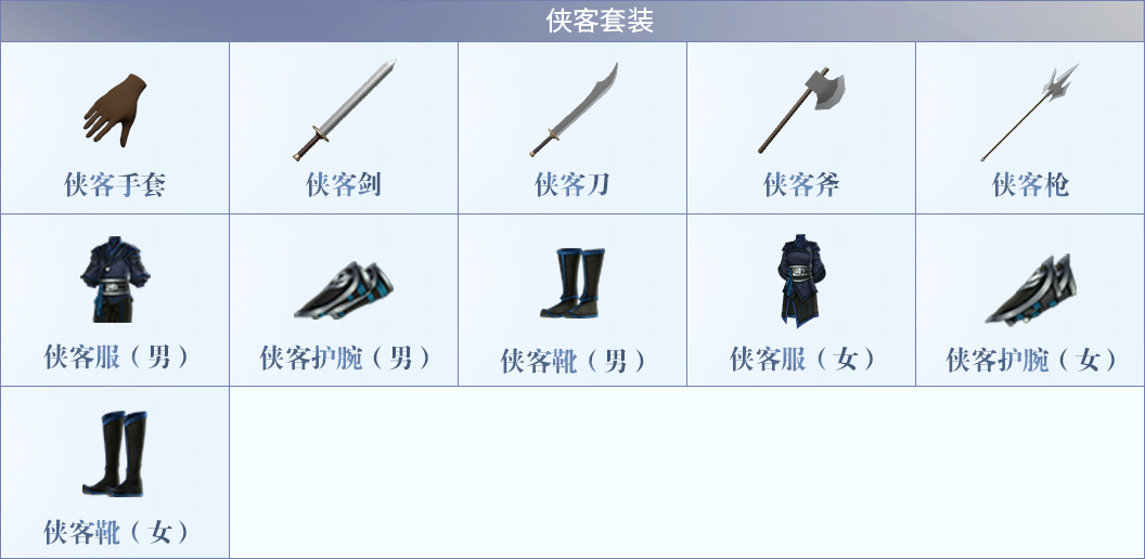 侠客套装:新手套装,穿戴后有少许属性加成。