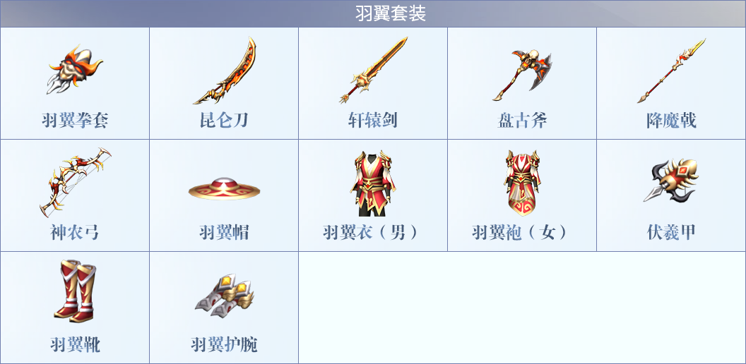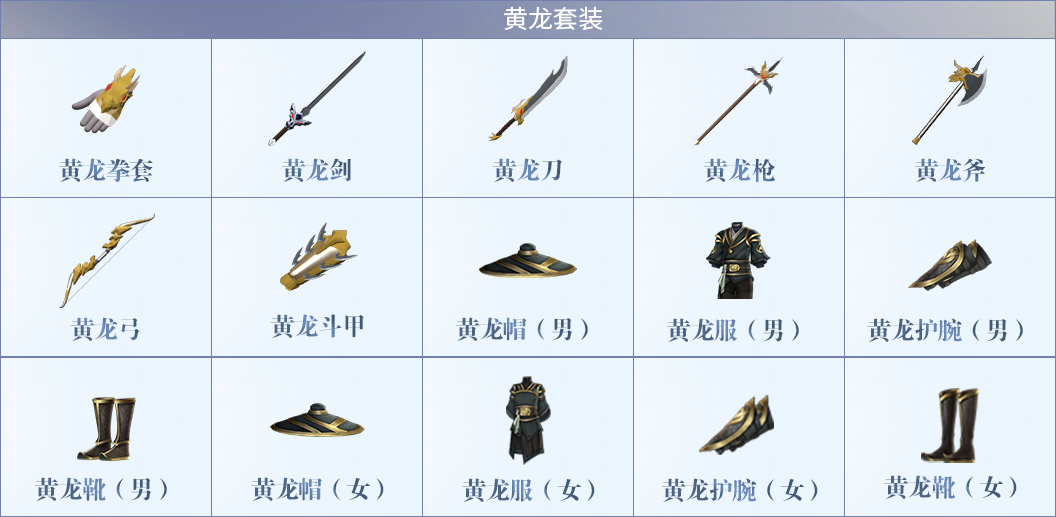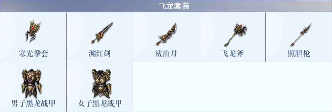 飞龙套装(青云殿):武器中蕴含龙气,是罕见的极品武器,青云殿内怪物携带。
