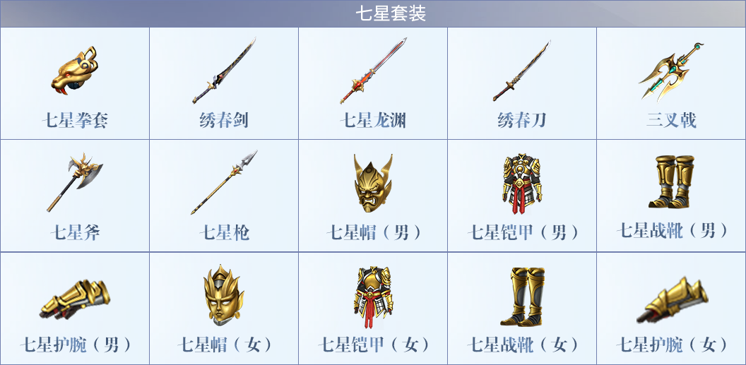 七星套装(一世皇帝陵):武器中珍品,颇具王者之风,一世皇帝陵内概率掉落。