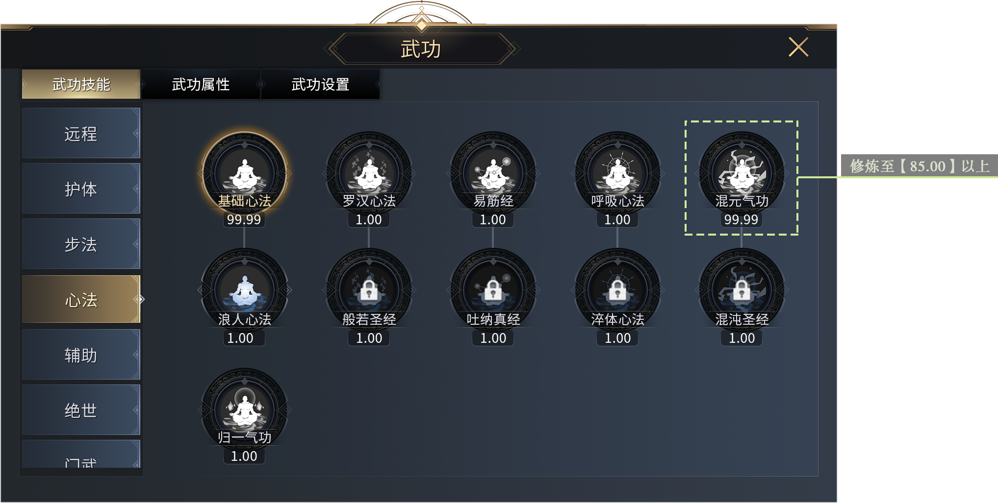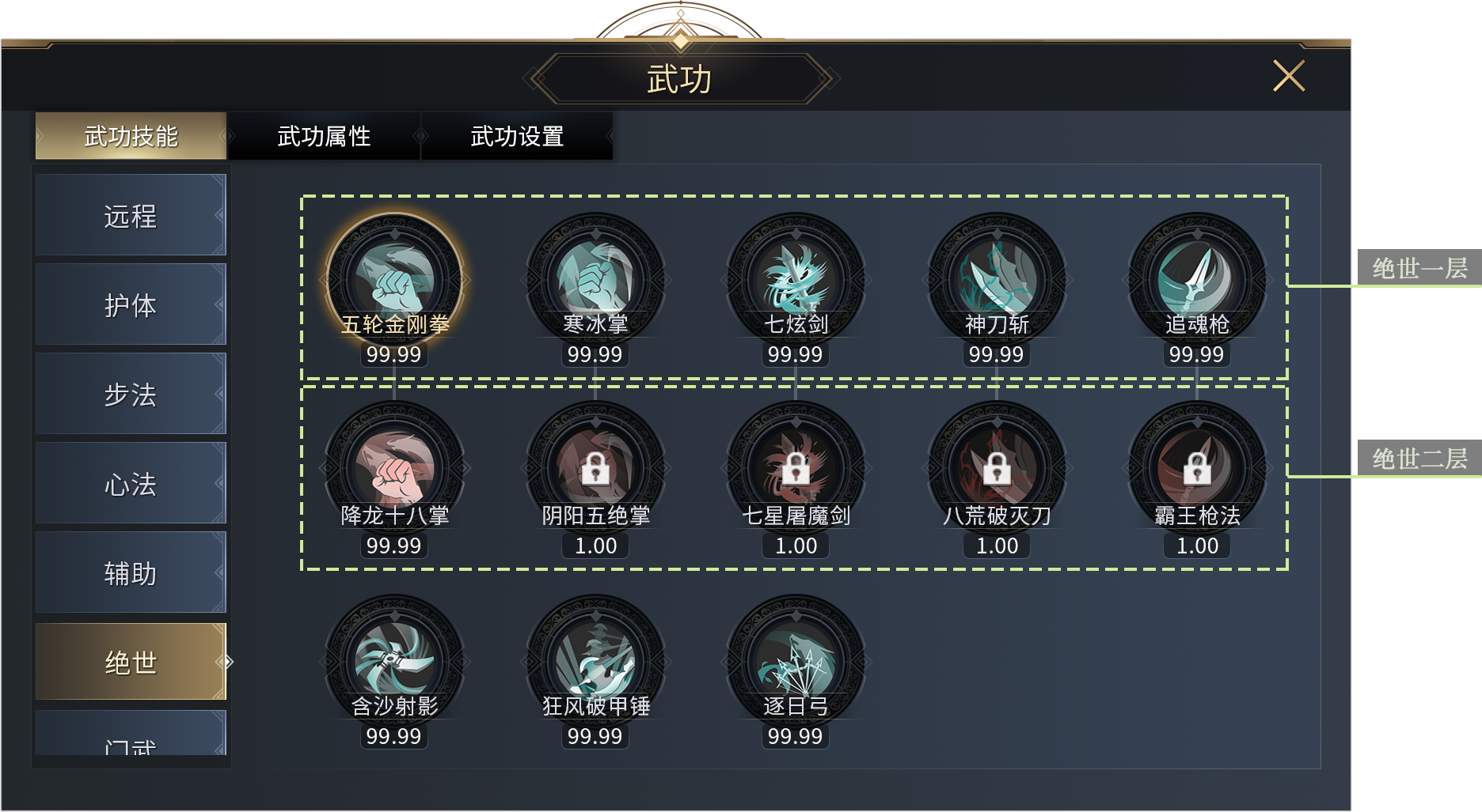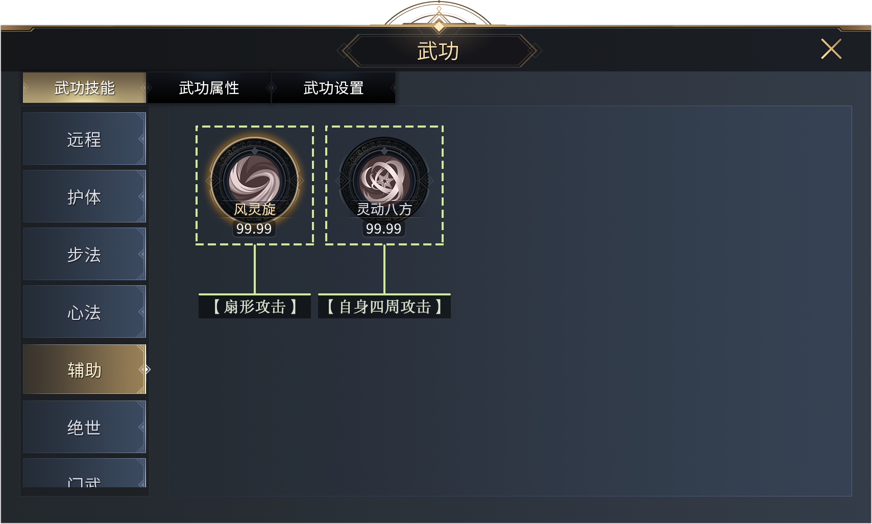 3、使用辅助类武功需搭配满级【99.99】级攻击类武功