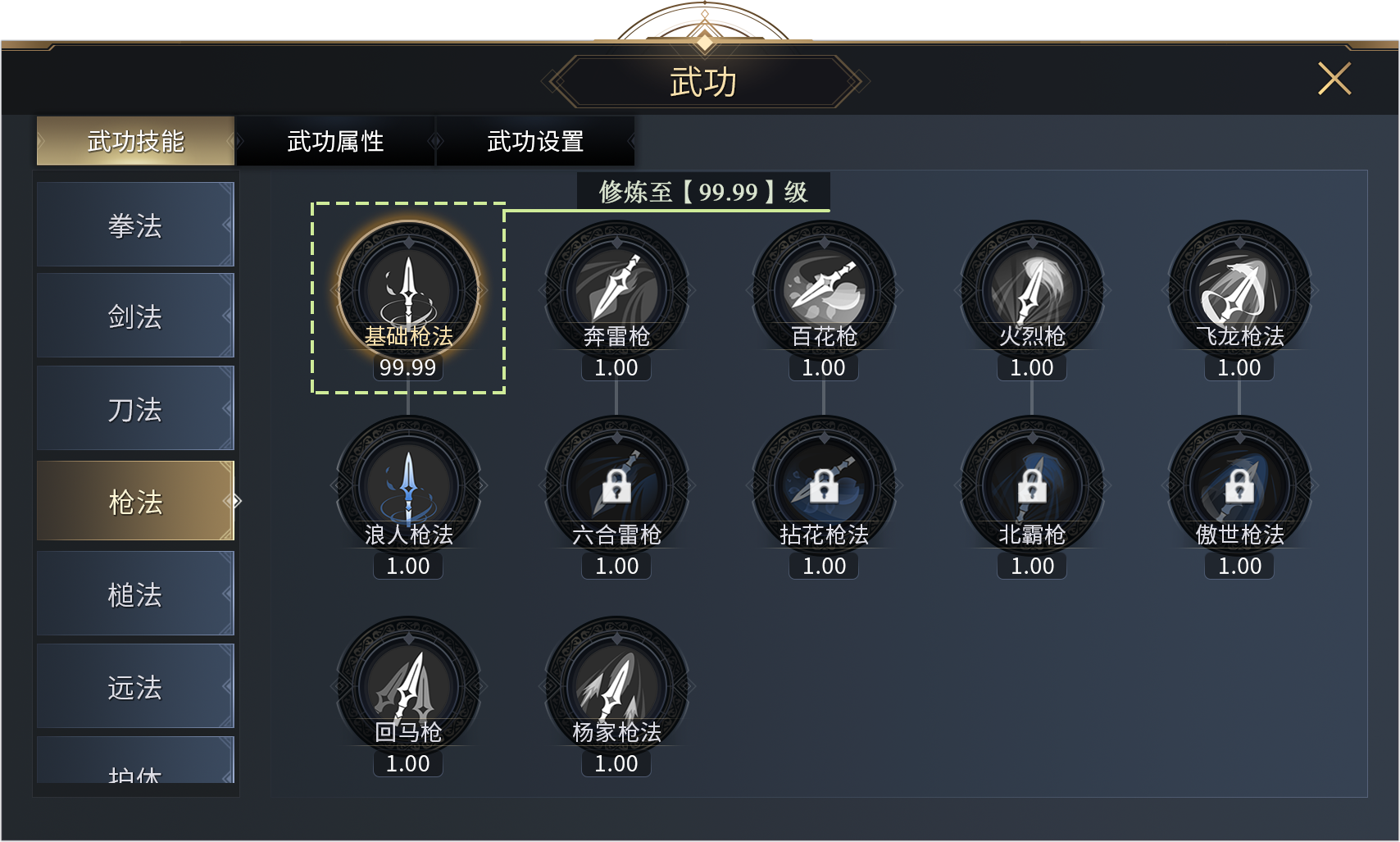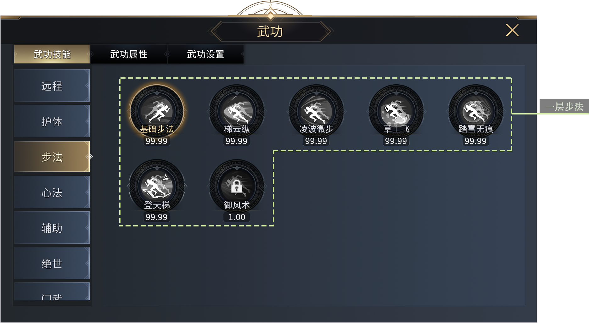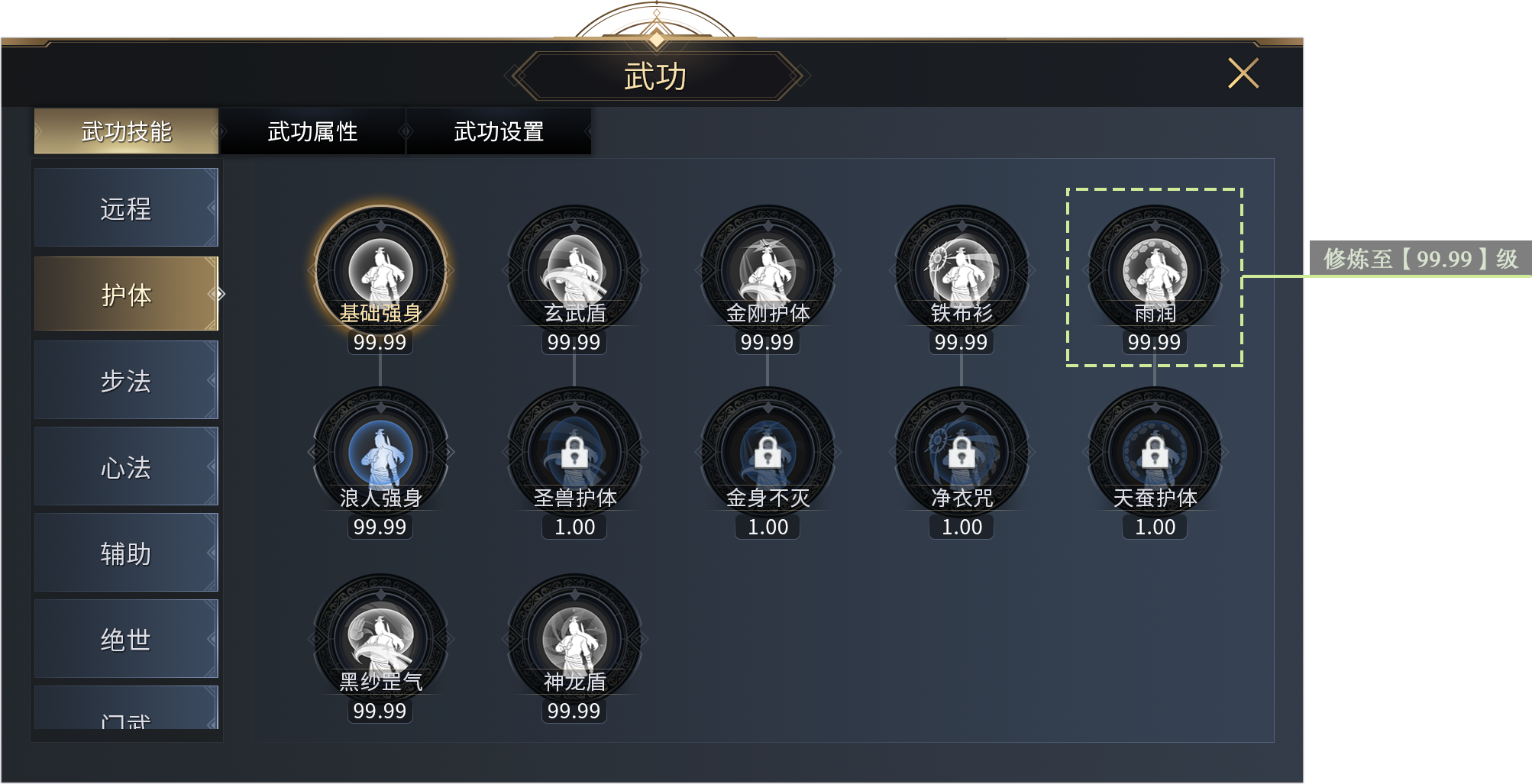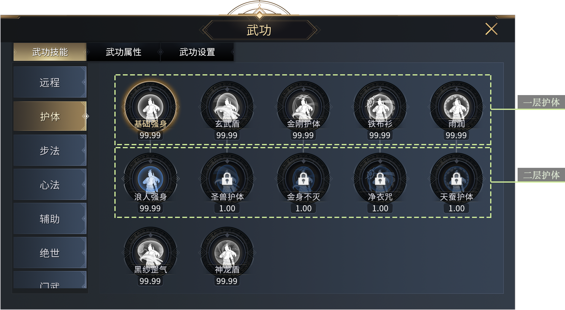 3、使用辅助类武功需搭配满级【99.99】级攻击类武功