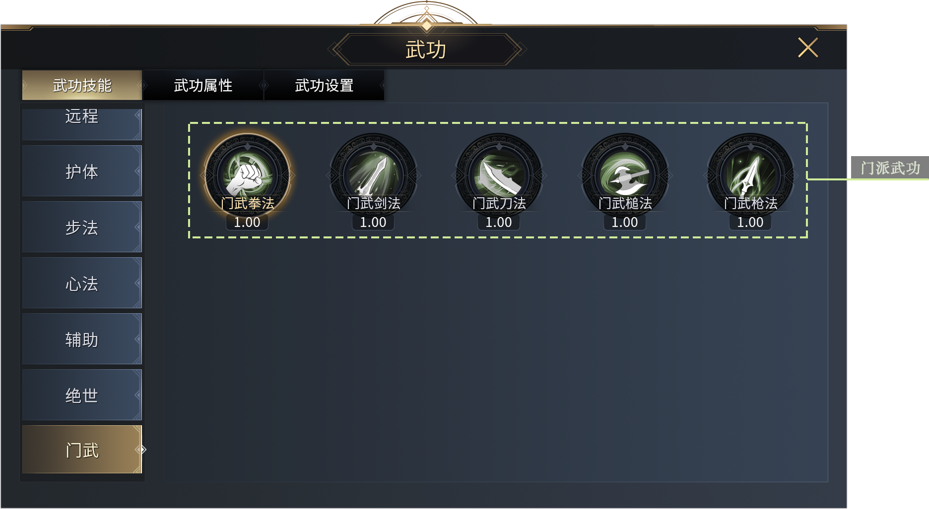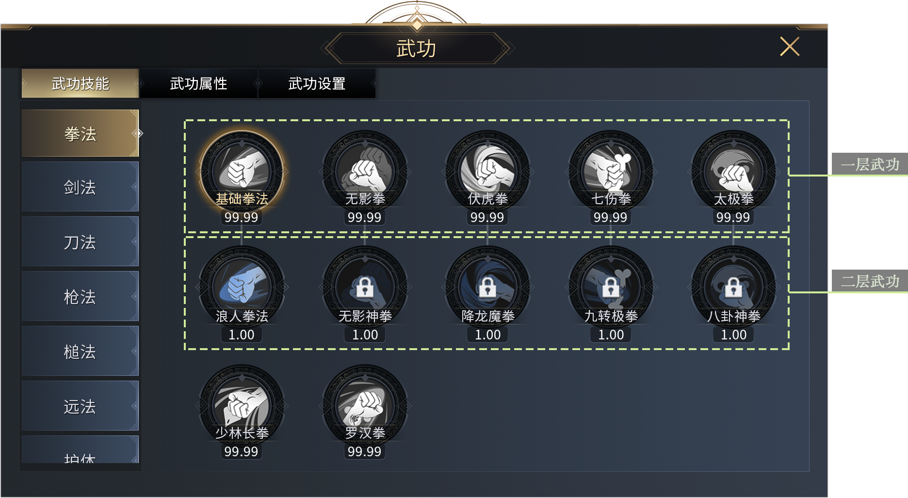 2、攻击类武功包含:【一层武功】【二层武功】【绝学一层】【绝学二层】【门派武功】