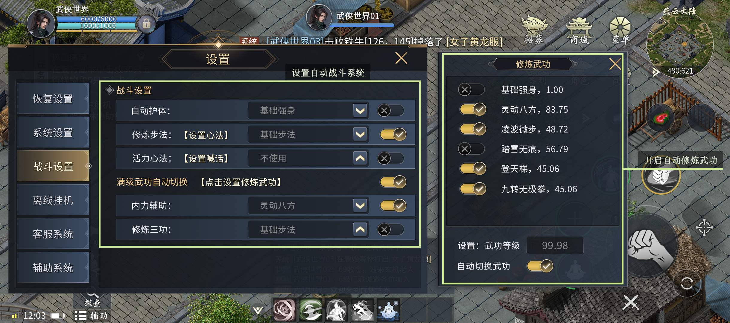 5、在线练功里还可以设置自动开启护体以及远程消耗设置。