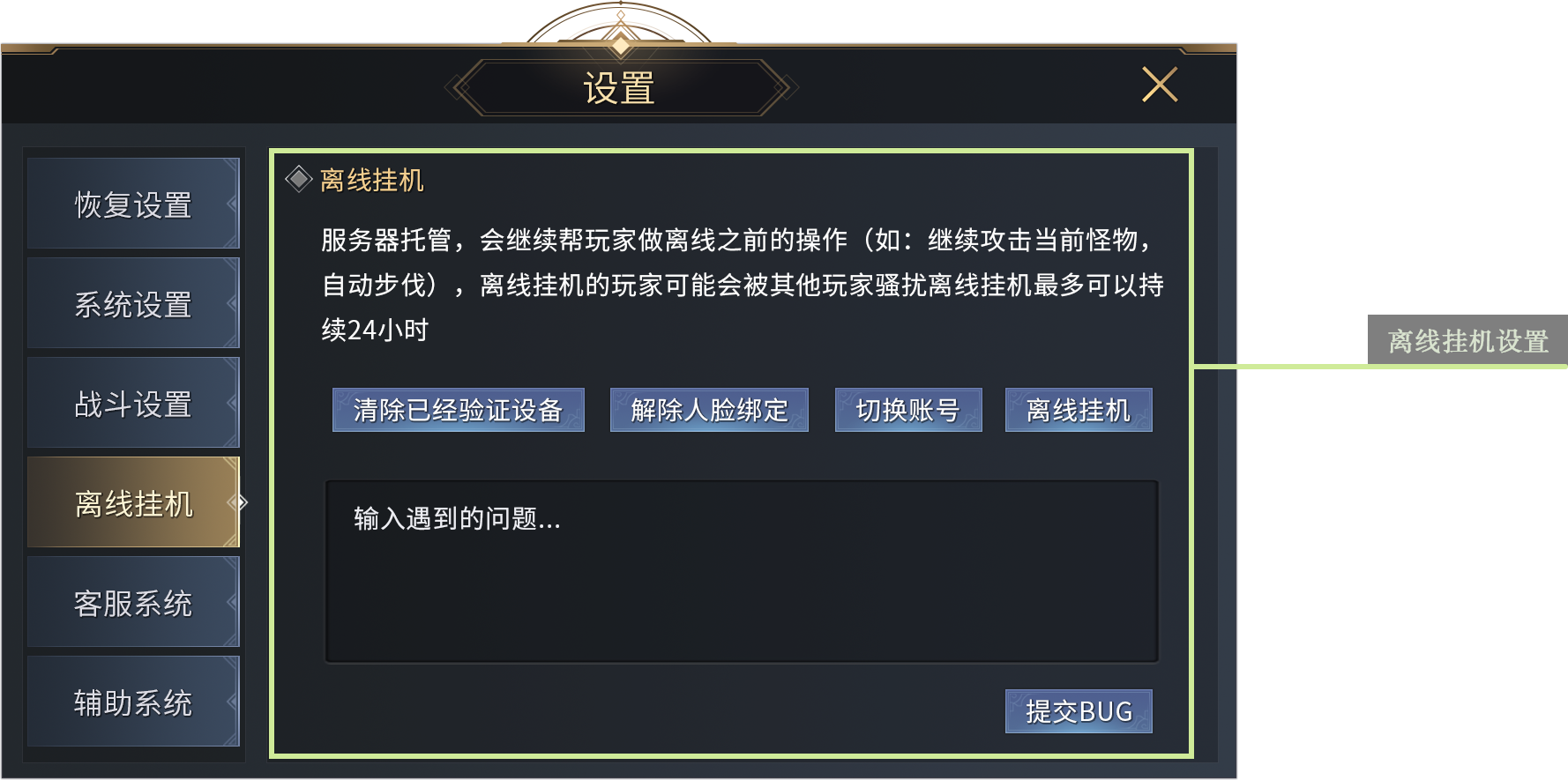 请注意,离线挂机只针对某一怪物进行使用,该打击怪物倒地则角色原地保持架势状态,不会找寻其他怪物进行攻击。