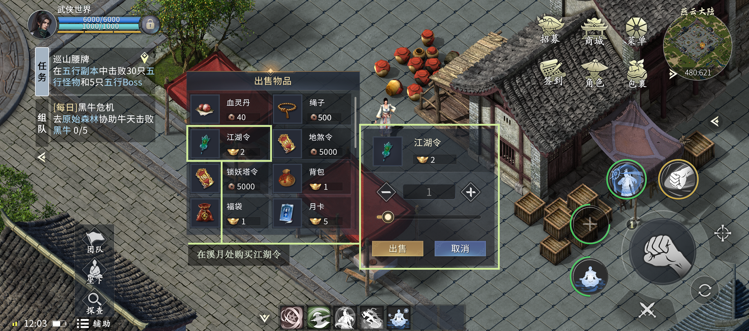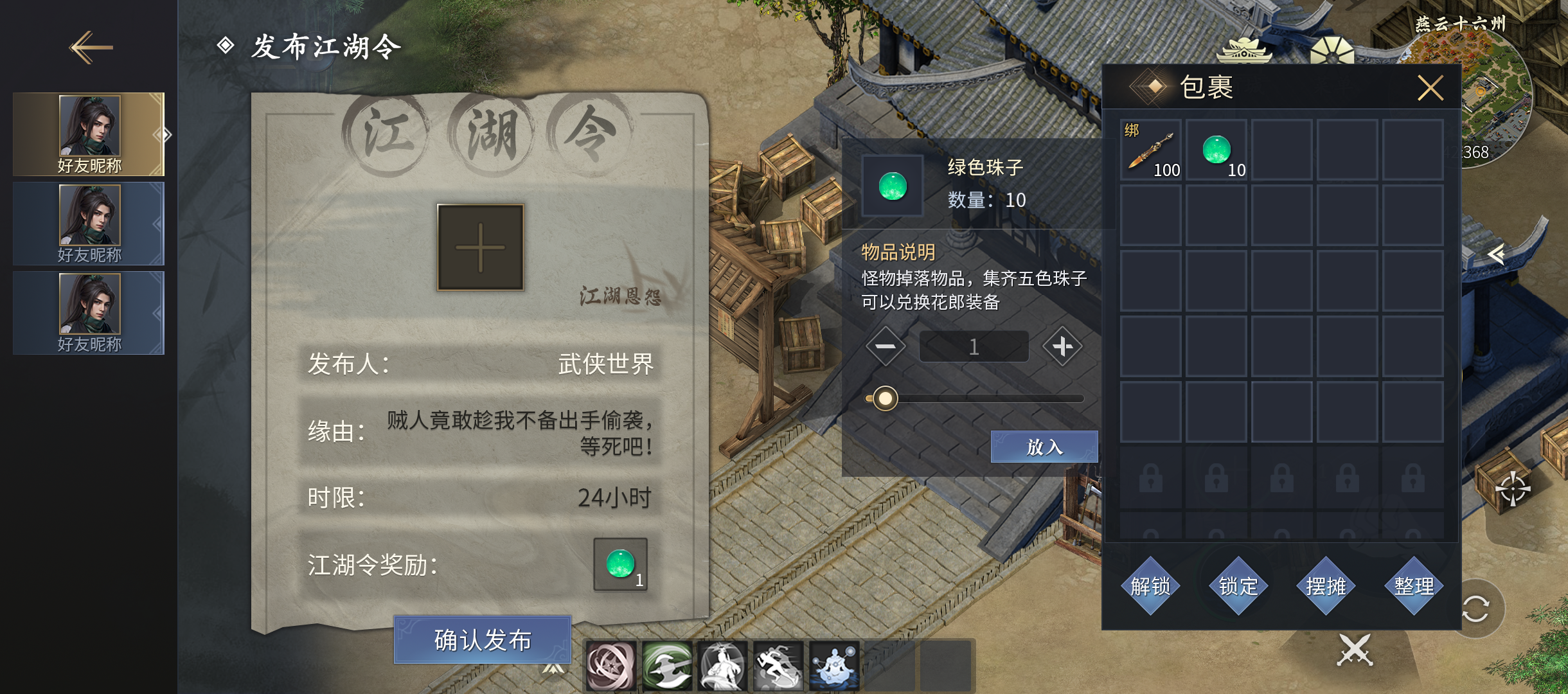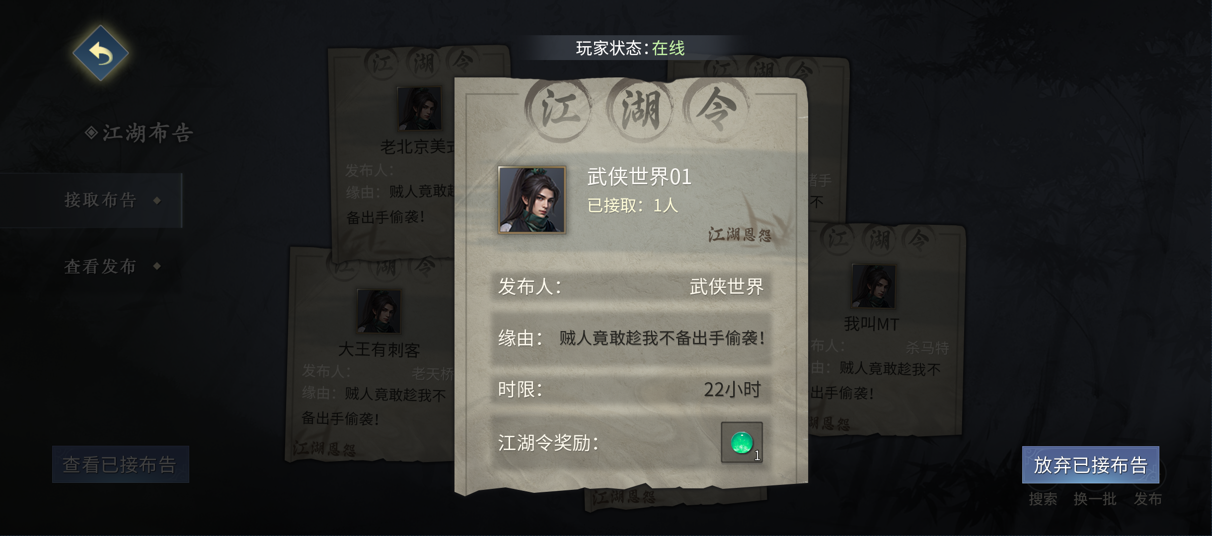 3、发布和接取江湖令任务在总捕头旁的布告牌,江湖令奖励物品,只能放可交易物品;