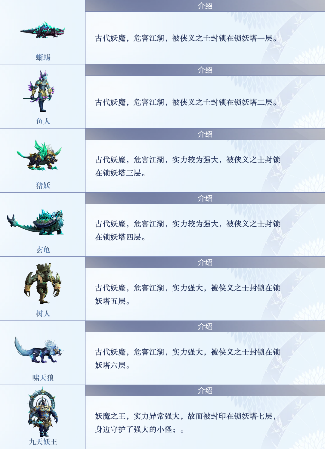 从此捉妖行业,在民间盛行。继而衍生出“捉妖天师”和“捉妖联盟”等捉妖群体。最终,铸剑师与众多捉妖人士精心设计了诱妖计划,将凶兽封印在锁妖塔。