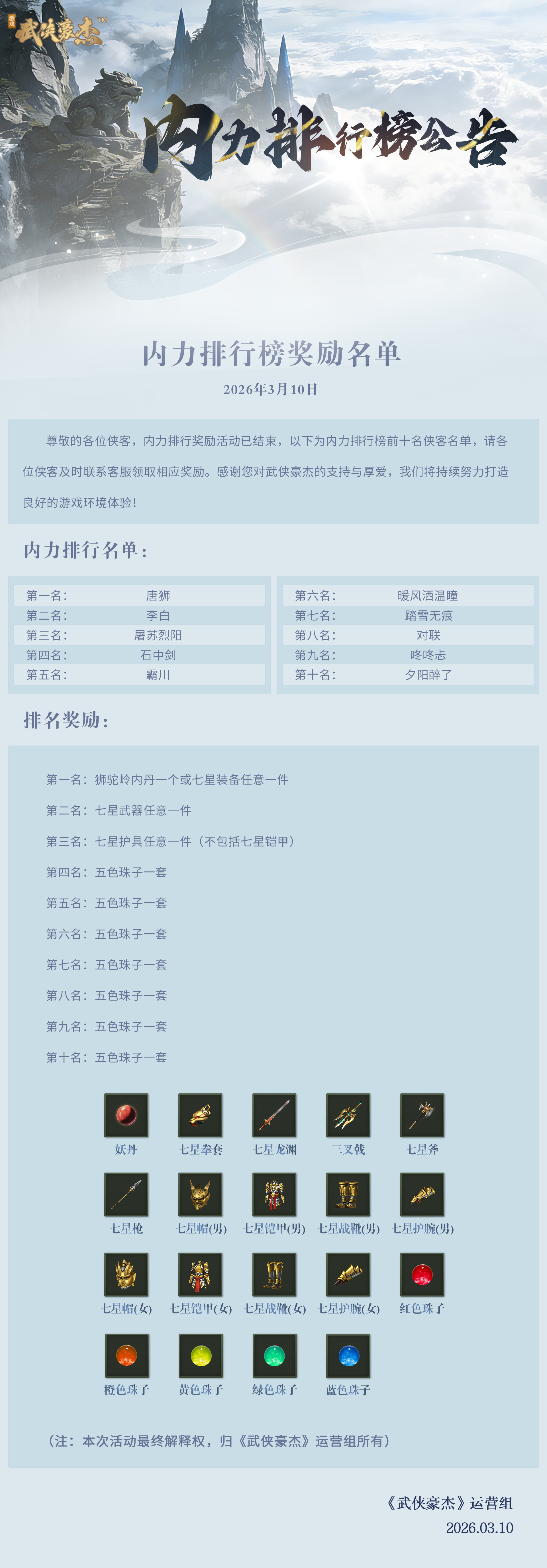 《武侠豪杰》 - 《武侠豪杰》内力排行榜前十名公告