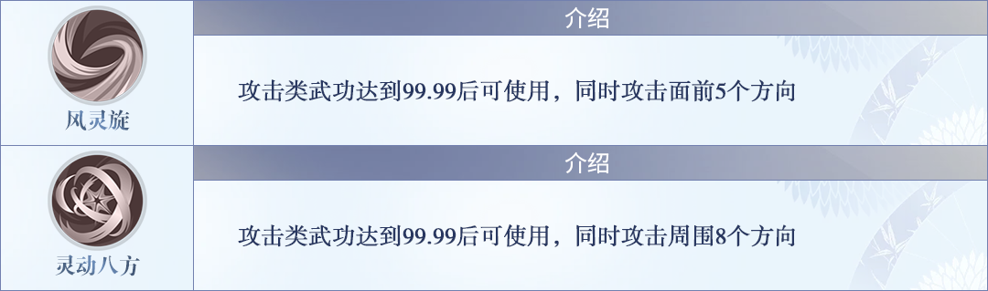 1、辅助武功是搭配攻击类武功使用 2、攻击类武功修炼达到99.99以后才可以使用 3、【风灵旋】达到99.99后才可以学习【灵动八方】 4、修炼辅助武功时,必须要攻击多个怪物;攻击单个怪物时,不会增加武功修炼值