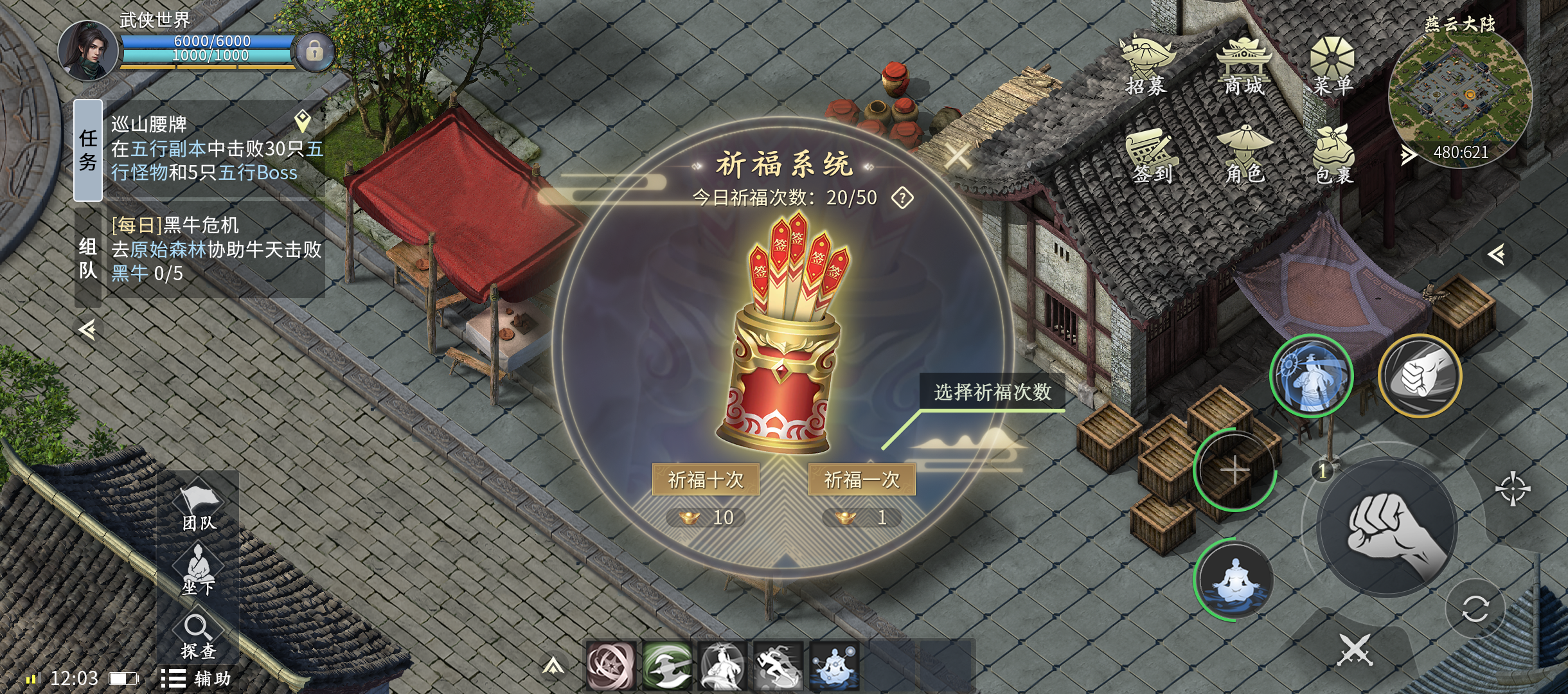 祈福系统是玩家通过花费金子,便可随机抽取获得游戏道具的游戏活动。一个金子可以祈福一次,每天上限50次。